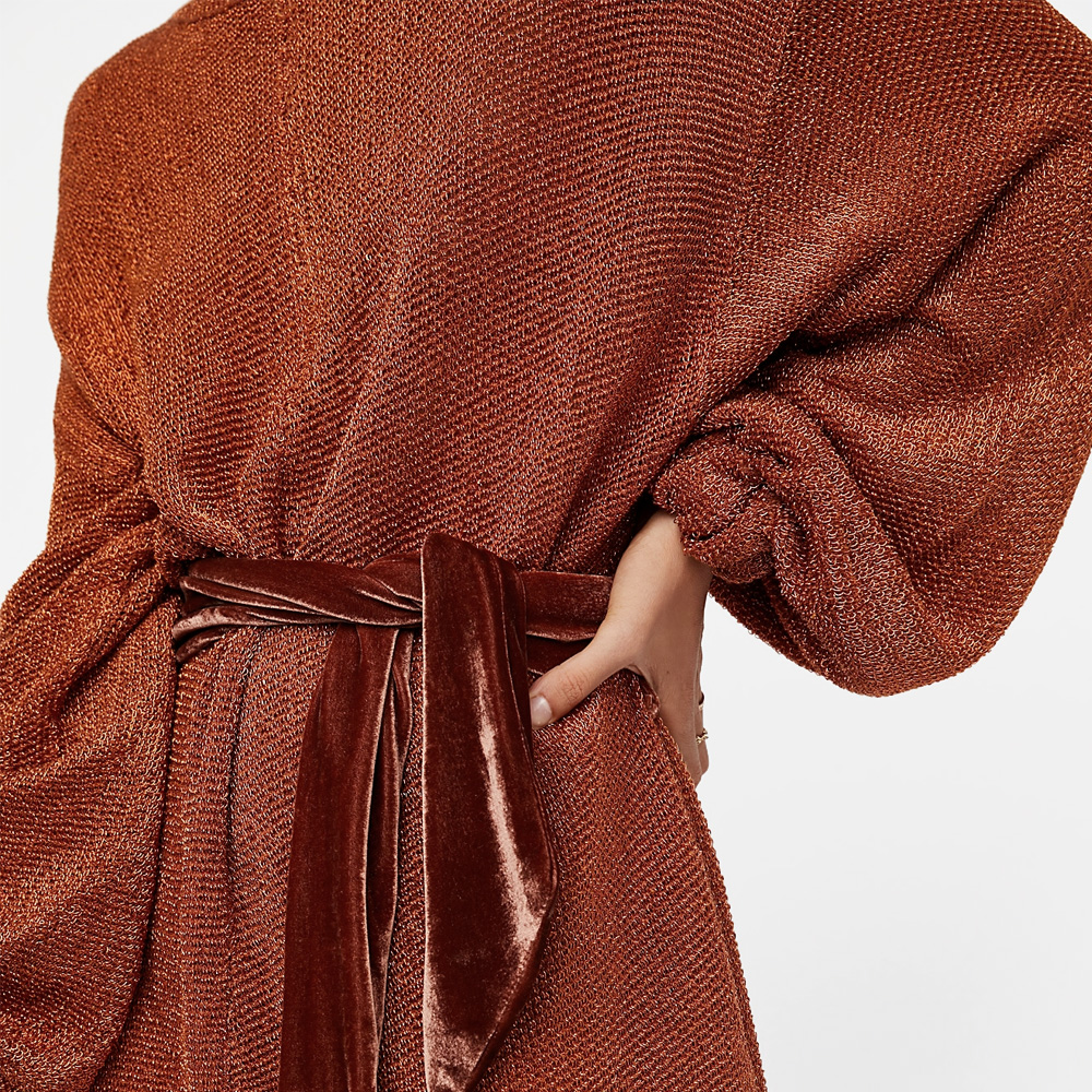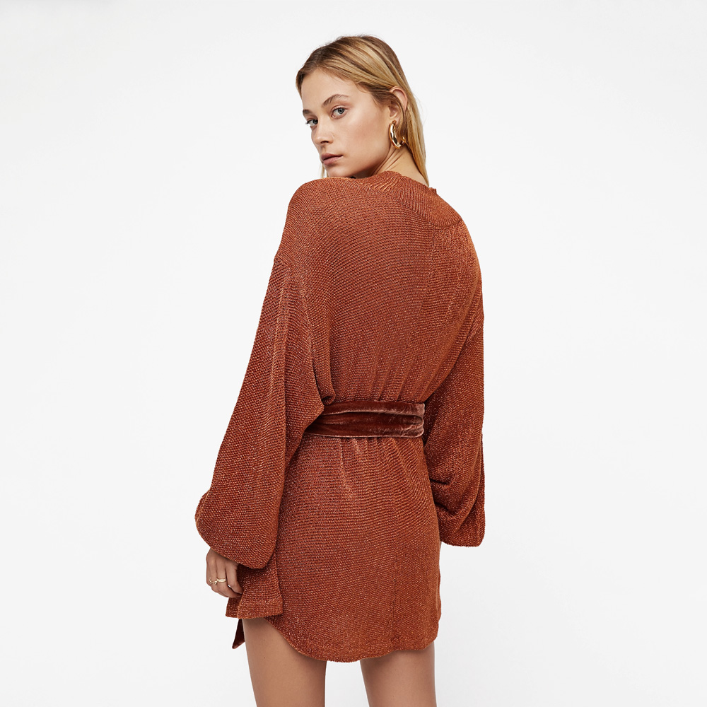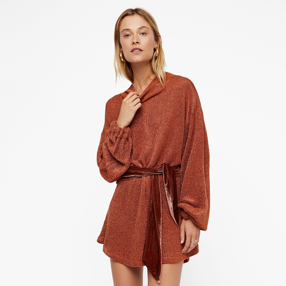 In a slouchy silhouette, this mini sweater dress features an allover lurex shine. Dolman style sleeves – Ribbed trim – Contrast velvet waist tie