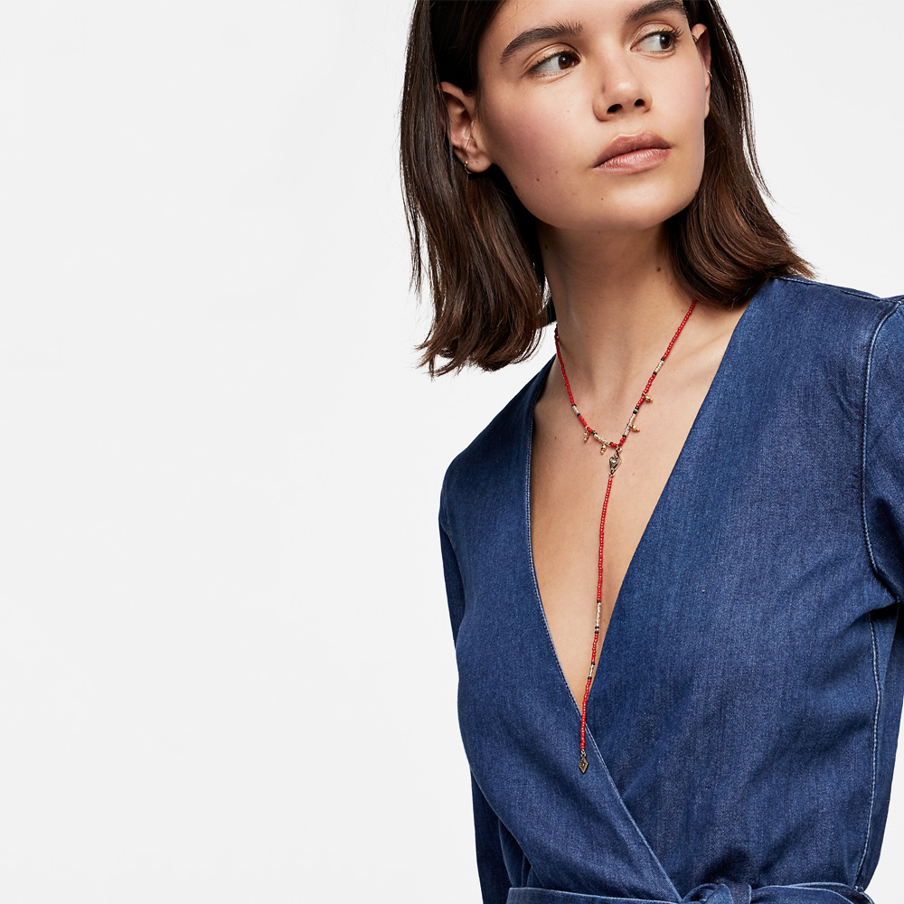 Lariat necklace featuring a bohemian-inspired beaded design.