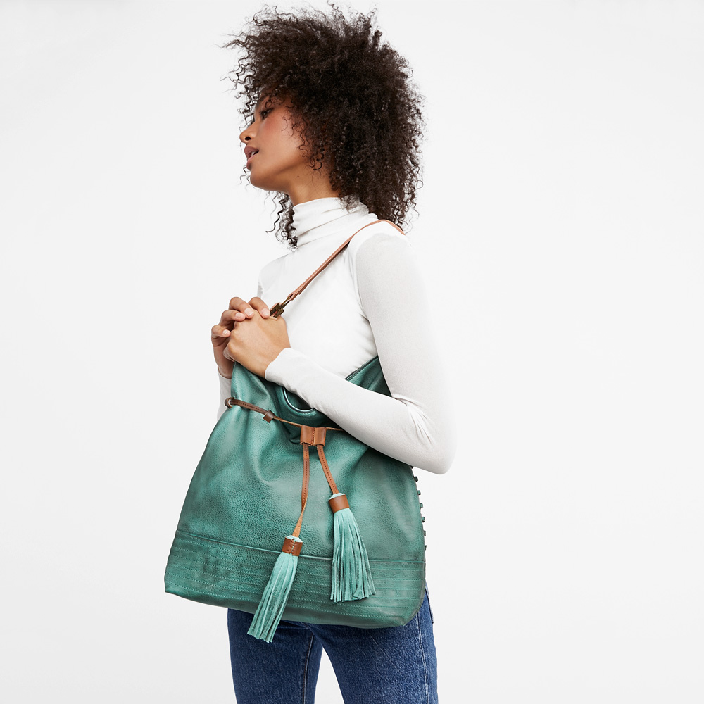Printed lining with compartments for storing Lace-up side details Drawstring closure Fringe accents