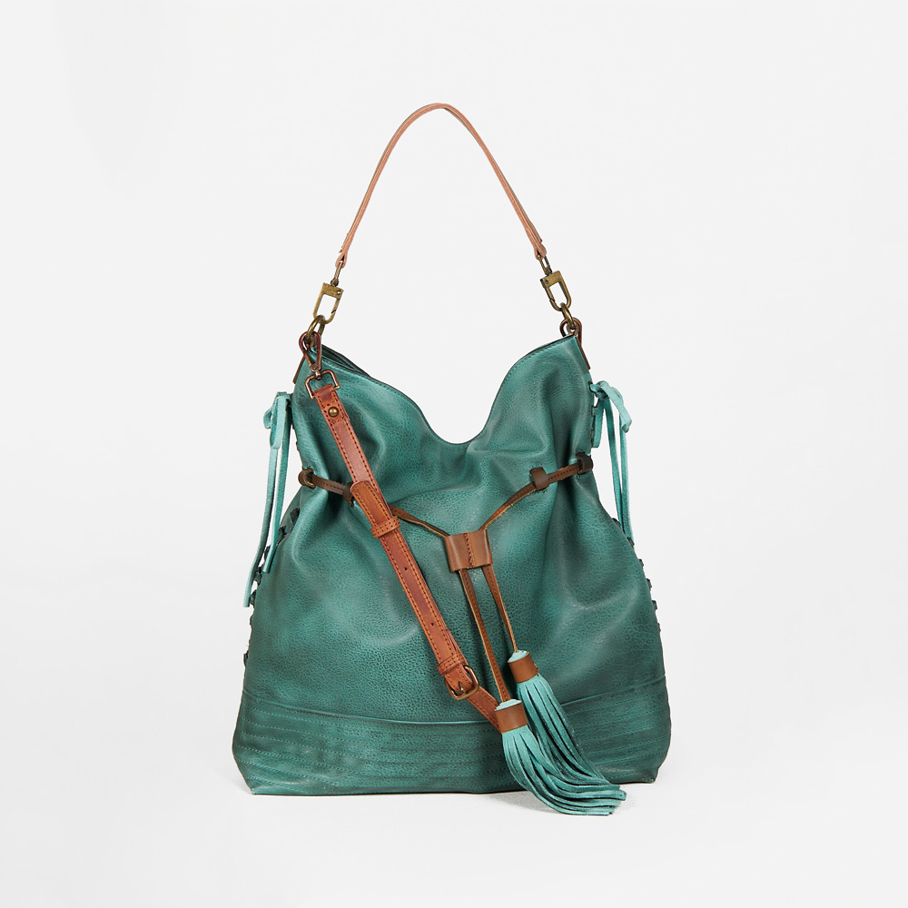 Slouchy faux leather bag with suede accents. Features removable and adjustable straps for an easy carry.